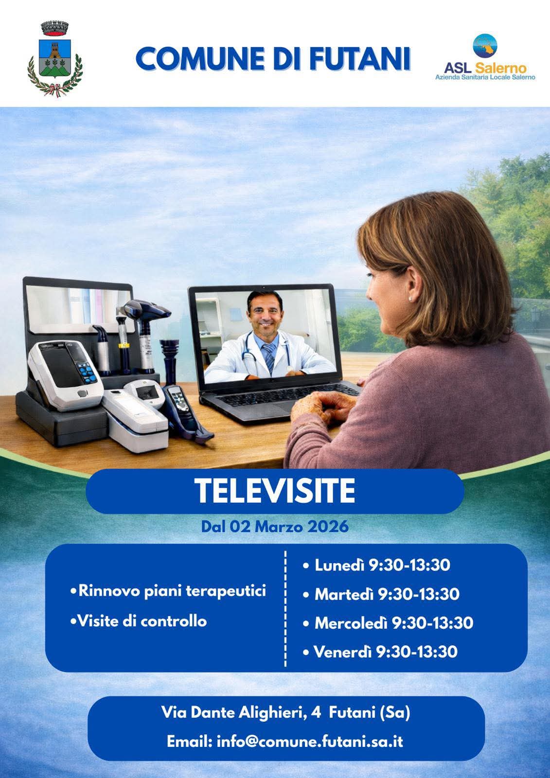 In collaborazione con l'Asl Salerno, dal 2 marzo 2026 è attivo a Futani l'Ambulatorio Virtuale di Comunità. Un servizio di telemedicina che consente di effettuare i consulti medici a distanza, il rinnovo dei piani terapeutici e visite di controllo, attraverso strumenti digitali e con il supporto del personale autorizzato.